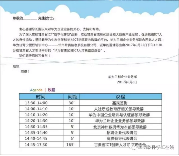 为了深入贯彻甘肃省ICT“数据化转型”战略,推动甘肃省信息化建设和大数据产业发展,促进我省ICT人才的良性流动,搭建起华为生态伙伴和华为ICT学院双性选择的平台。华为兰州企业业务部联合西北人才网、华为甘青宁授权培训中心——兰州希赛信息系统有限公司,诚挚邀请您出席2017年9月22日下午13:30分在甘肃省人才市场举行的“华为甘肃区域ICT人才联盟双选会”。