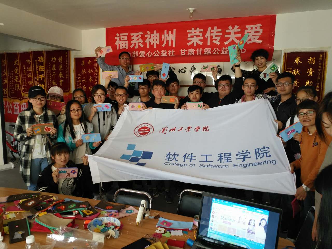 善举凝聚美德,爱心传递力量。2017年4月23日,软件工程学院20名学生党员、预备党员、入党积极分子在学生党支部的召集和带领下来到甘肃(兰州)甘露公益中心参加了的“福系神州,荣传关爱”为主题的笔袋手工制作活动。副院长辛欢老师也来到活动现场,与大家一起共同参与献爱心活动。