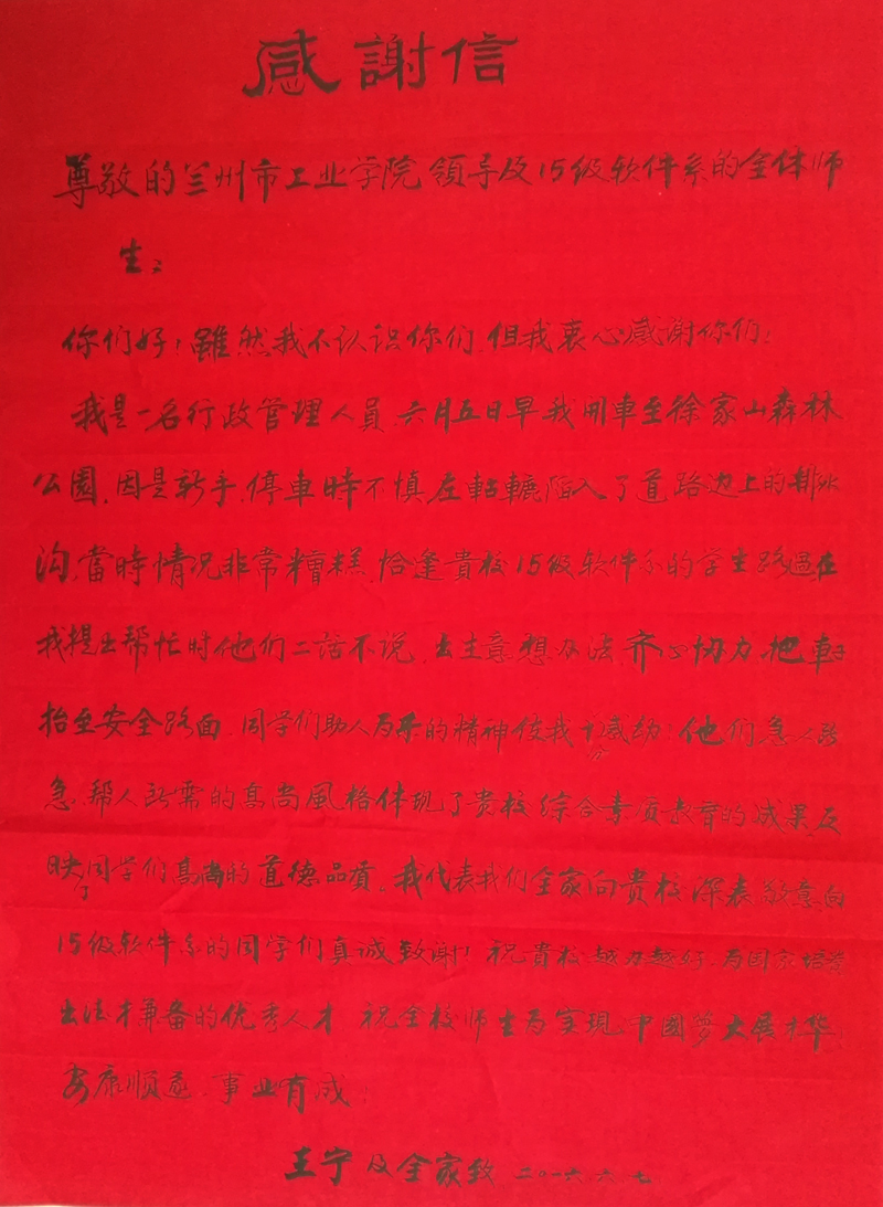6月5日早,王先生在徐家山公园停车时发生意外,恰逢我校软件15级同学们路过,大家出主意想办法把车抬至安全路面,当王先生表示感谢希望留下姓名和联系方式,同学们婉言拒绝,王先生表示,同学们的高尚风格体现了学校综合素质教育的成果,反映了同学们高尚的道德品质。