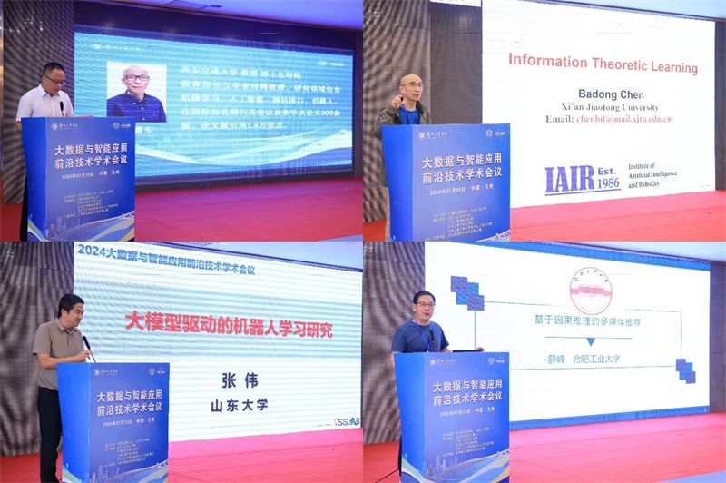 在大会主题报告环节,西安交通大学陈霸东教授(教育部长江学者特聘教授)、山东大学张伟教授(入选国家领军人才计划)、合肥工业大学薛峰教授(省级领军人才)分别围绕《Information Theoretic Learning》《大模型驱动的机器人学习研究》《基于因果推断的多媒体推荐》,就大数据与人工智能领域的热点和行业前沿动态作了报告,报告内容丰富,信息量大、启发性强,为与会者带来了宝贵的学术思想和实践经验。