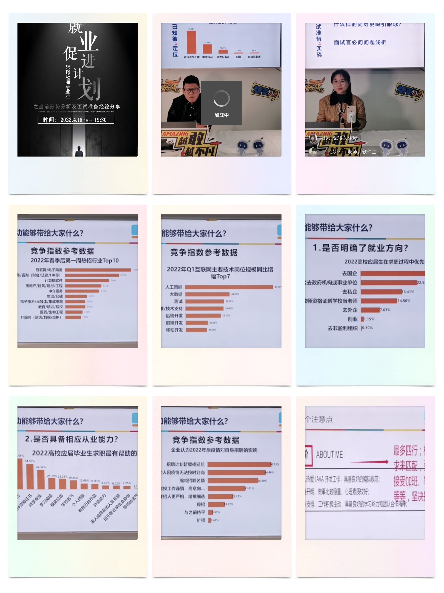 2022年4月18日晚,学院组织2022届、2023届毕业生共计400余人参加由易腾创想智能科技有限公司举办的“就业促进计划之当前IT行业形势分析及面试准备经验分享”直播活动。