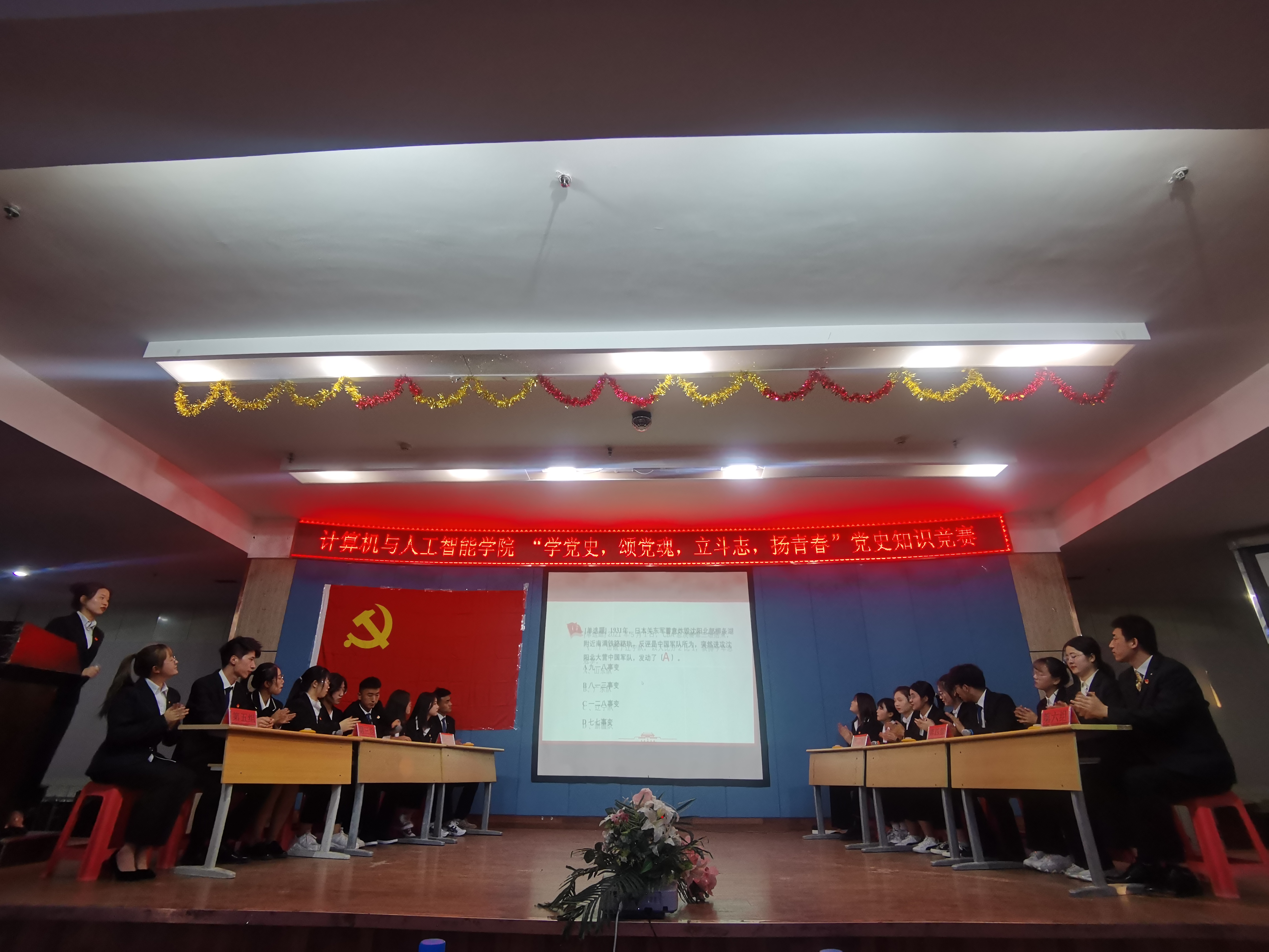 经初赛选拔,共有六支队伍进入决赛。竞赛环节分为“舍我其谁”、“先声夺人”、“音乐抢答”及“自选模块答题”四个环节。6支参赛队伍精神抖擞、争分夺秒,积极踊跃答题;台下观众热情高涨,助力选手,现场氛围紧张有序。“自选模块答题”环节中,通过红色诗词、经典故事重温历久弥新的奋斗精神。最后,赵亚明书记对本次活动的进行总结。经过紧张有序的角逐,网络20-2班获得本次党史知识竞赛第一名,活动在合唱《没有共产党就没有新中国》的歌声中结束。