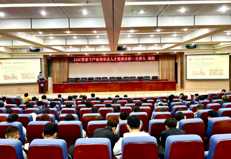 4月18日晚,计算机与人工智能学院在第三学术报告厅举办“AIGC背景下产业变革及人才需求分析”专题讲座。商汤科技解决方案工程师寇松应邀担任主讲人。