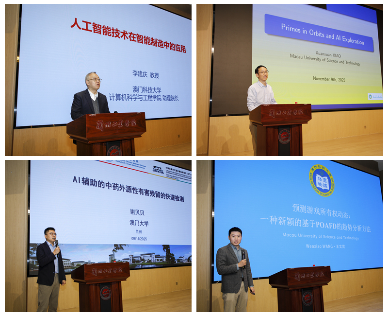 主题报告环节中,澳门科技大学李建庆教授、肖玄玄副教授、澳门大学谢贝贝博士和澳门科技大学王文霄博士分别以《人工智能技术在智能制造中的应用》《群轨道中的素数及机器学习在素数研究中的应用》《AI辅助的中药外源性有害残留检测》《预测游戏所有权动态:一种新颖的POAFD趋势分析方法》为题,作了精彩的报告。报告聚焦人工智能前沿,纵论技术热点、横览行业应用,内容翔实、启发性强,为与会者奉献了一场精彩的思想盛宴。这场报告不仅是一次知识的集中赋能,更点燃了与会者探索与创新的热情,获得了广泛而热烈的反响。