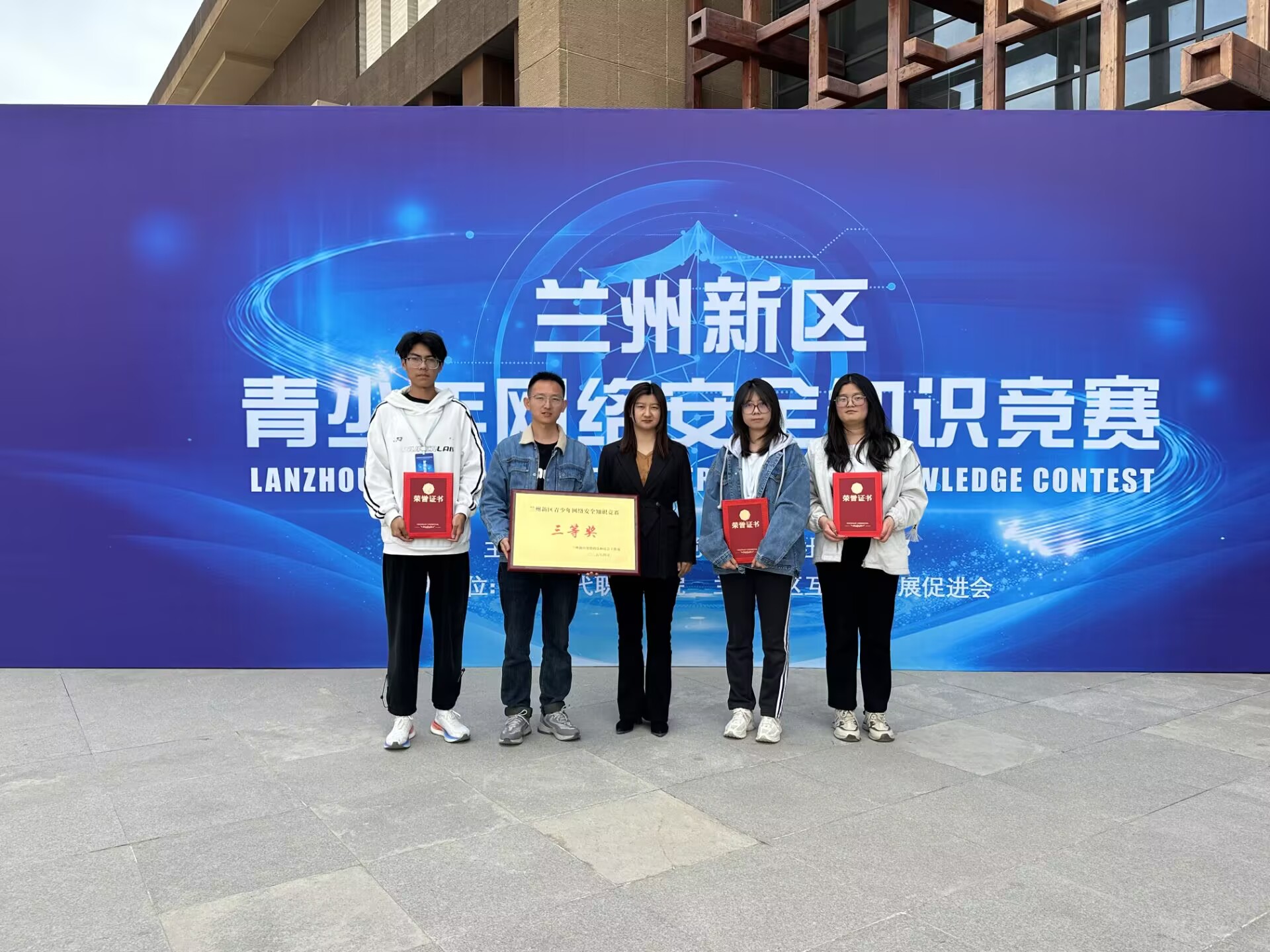 4月24日,由兰州新区党群政法和社会工作部、兰州现代职业学院及兰州新区互联网发展促进会联合主办的兰州新区青少年网络安全知识竞赛总决赛在兰州现代职业学院圆满落幕。我校计算机与人工智能学院网络22-2班周沁漫、赵嘉乐,网络23-2班王岩岩组成的参赛团队(指导教师:徐立龙)经过激烈比拼,最终荣获三等奖。