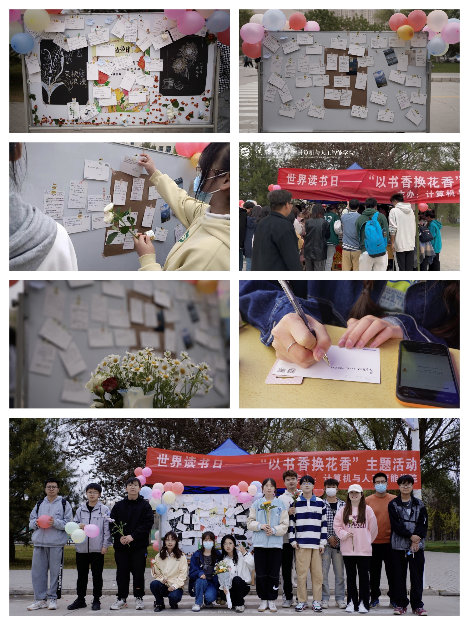 花香满工院,书香自心间。为进一步提升全校同学的阅读主动性,打造书香校园,在第二十八个“世界读书日”来临之际,计算机与人工智能学院于4月22日、23日在第三教学楼楼下开展了“以书香换花香”主题活动。一半书香,一半花香,两者相撞,自心绽放。